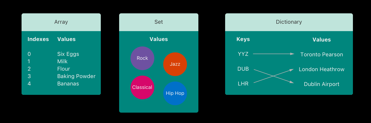 Arrays, sets, and dictionaries in Swift are always clear about the types of values and keys that they can store.