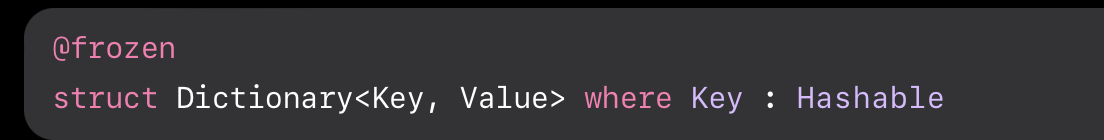 단 딕셔너리 안의 키는 같은 이름을 중복해서 사용할 수 없다. (아래 사진의 조건과 같이 where Key: Hashable 이므로...)